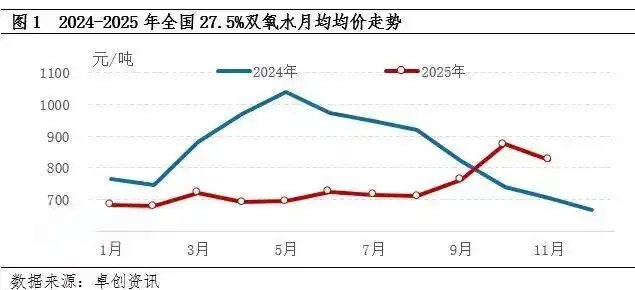 2025年,中国双氧水市场价格呈现出“先低后高”的走势,整体均价同比大幅下滑。截至12月3日,全国27.5%浓度的双氧水平均价格已降至735元/吨,相较于2024年的850元/吨,下跌了13.53%。年内,双氧水的最低均价出现在2月下旬,为671元/吨,而最高点则出现在10月中旬,达到了893元/吨,价差高达222元/吨。